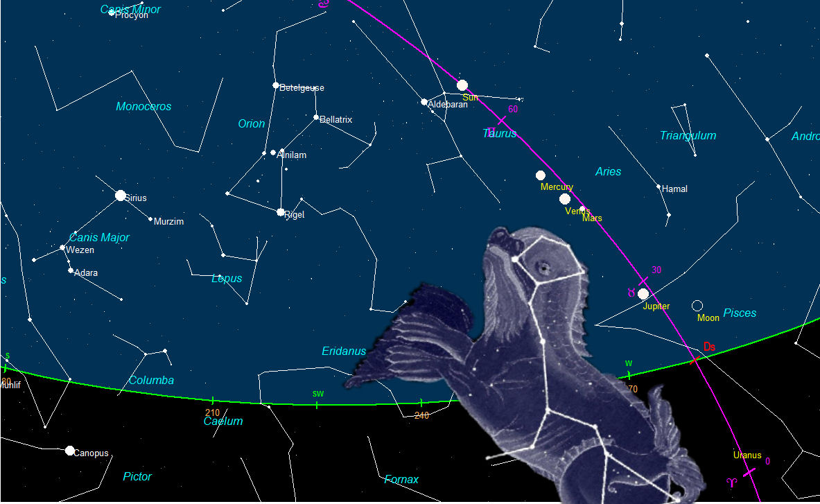 There are other things happening in May that are of note–say for example a lineup of planets that hasn’t happened for 30 years and won’t happen again for another 32 years. Yes–right here in the merry month of May, Mercury, Venus, Mars and recently Jupiter have been having a little conference of their own in the sign Aries and by the end of the month they will all be in Taurus. Not only that–but this confab is very very important–it carries messages and paradigms and inventions and revelations from unseen places. Cetus the whale (the monster–not the friendly whale that the children rescue)–this image requires us to address that which is dark and deep and important and could alter reality and he is staring (or glaring?) at these planets who have gathered at this time in our history.