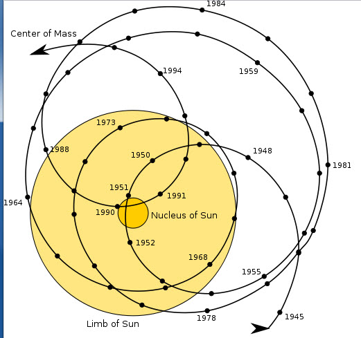 But: “The mass of the planets is about 1/750th the mass of the Sun and the center of mass of the solar system can move from close to the center of the Sun to up to one solar radius outside the surface of the Sun! Where the solar system barycenter is at any given moment is determine by the configuration of planets as they revolve around the Sun” (Michelsen in Tables of Planetary Phenomena 16).